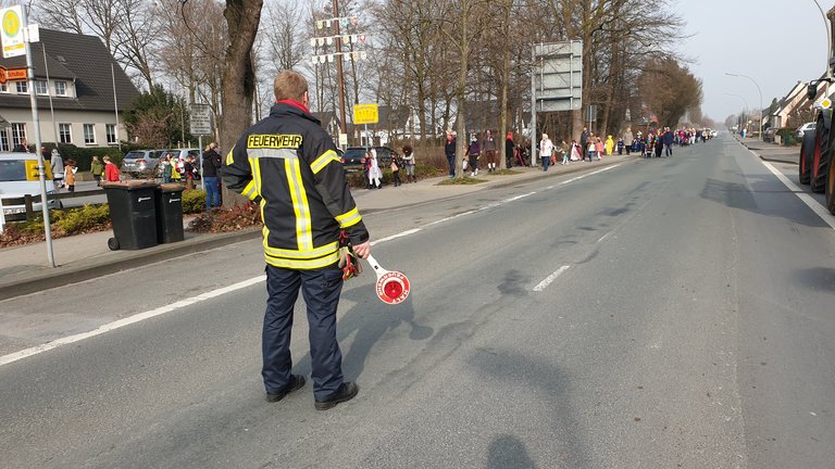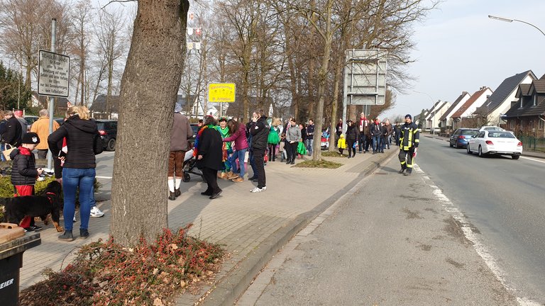 Wie jedes Jahr ziehen die Kinder, Lehrer, Erzieher und Eltern der Postdammschule sowie des Kindergartens durch das Dorf um den Auftakt zum Straßenkarneval zu feiern. Der Löschzug Lintel sorgt bei der Straßenüberquerung für die notwendige Sicherheit.