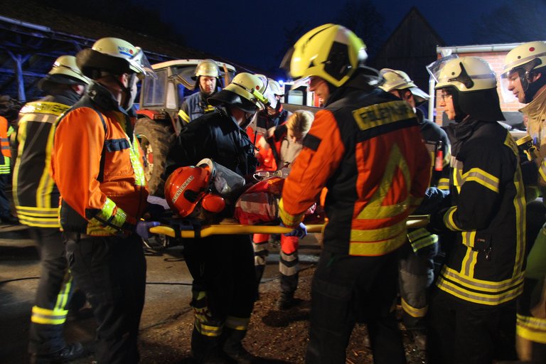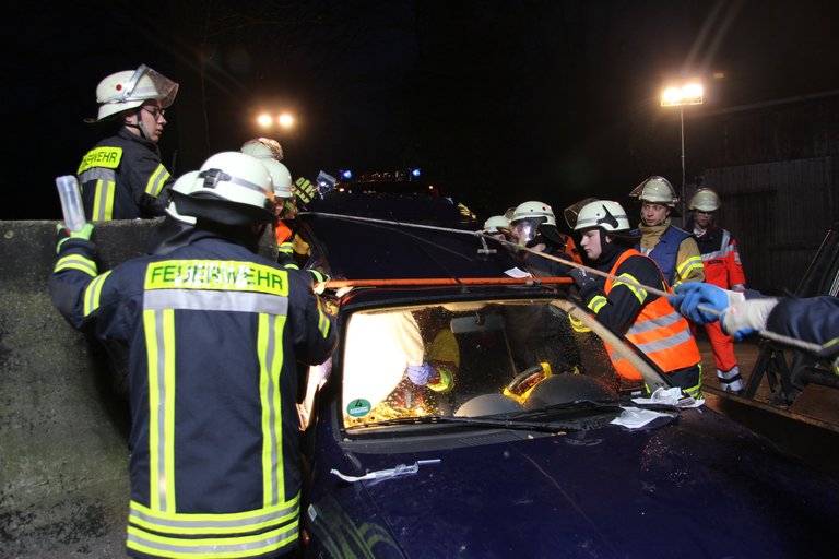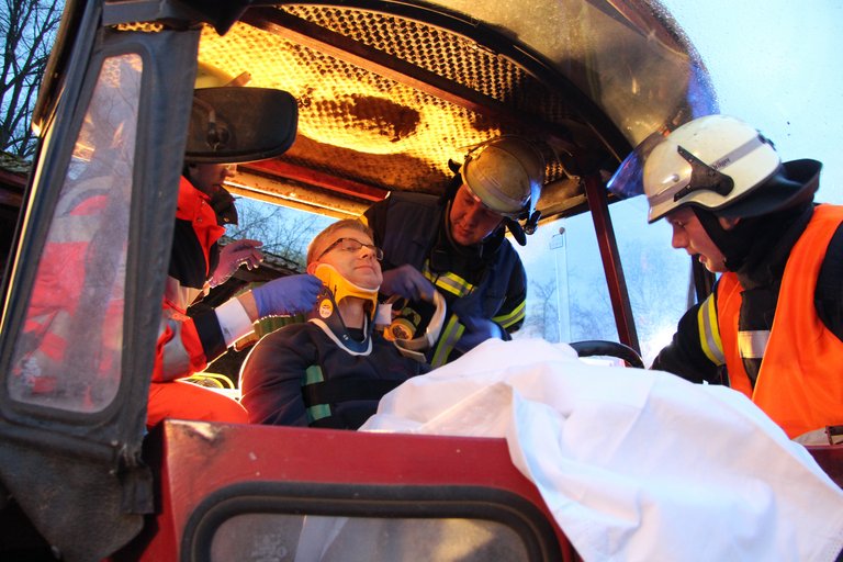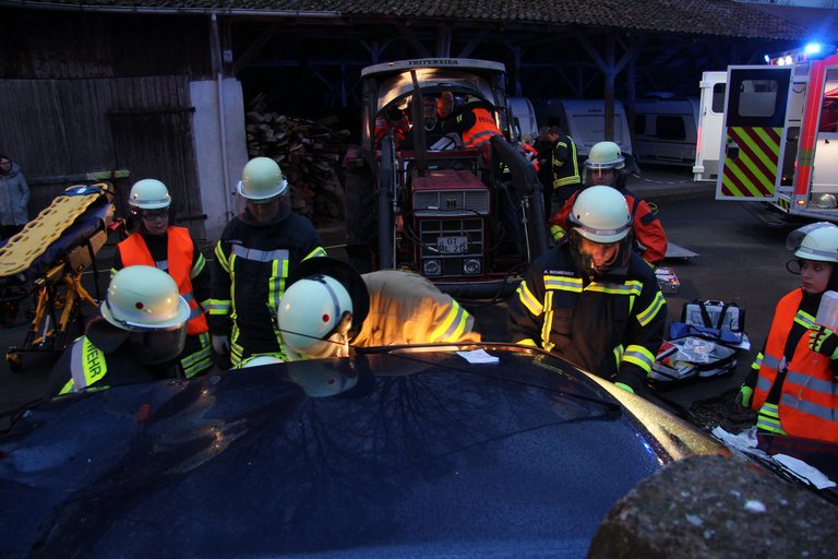 Als Höhepunkt des Themenblocks konnten sie das Erlernte schließlich realitätsnah in einer Abschlussübung in die Tat umsetzen. Das Übungsszenario sah vor, dass es auf einem Bauernhof zu einem Unfall zwischen einem Traktor und einem PKW gekommen war. Es galt drei Personen schonend zu retten. Zwei von ihnen mussten mit schwerem technischem Gerät aus dem deformierten Kleinwagen befreit werden. Daher wurden Scheiben und schließlich auch das Dach des PKW mit hydraulischem Rettungsgerät entfernt.