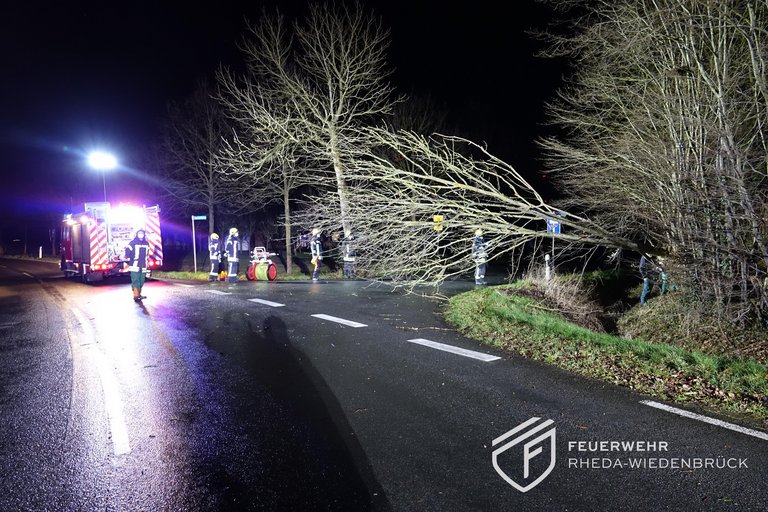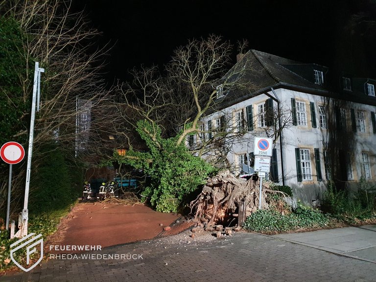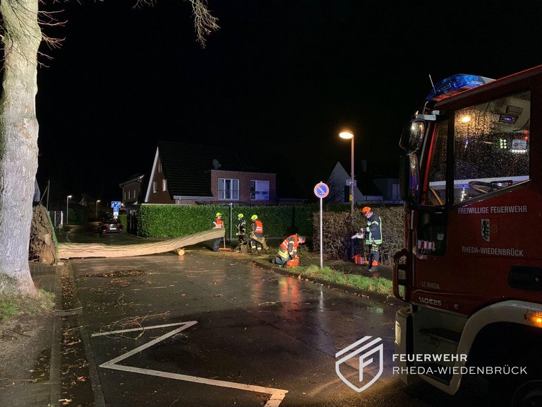 Bereits in der Nacht von Mittwoch auf Donnerstag hatte das Sturmtief Ylenia die Rheda-Wiedenbrücker Feuerwehr gefordert. Hier kam es zu 29 Alarmierungen, die meisten Einsätze mussten dabei im Stadtteil Batenhorst abgearbeitet werden. Auch hier beseitigten die Einsatzkräfte überwiegend umgestürzte Bäume oder sicherten Beschädigungen an Fassaden und Dächern.