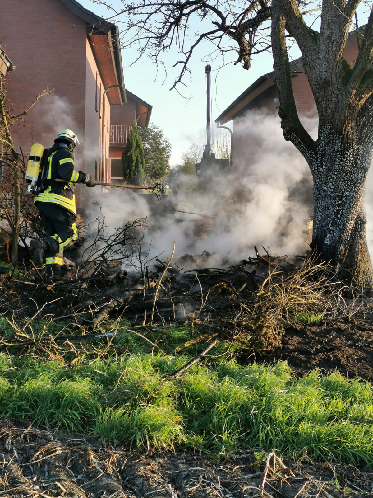 Am frühen Abend wurde der Löschzug Batenhorst zu einem Brandeinsatz an einem ländlichen Einfamilienhaus gerufen. Durch den starken Wind drohte das Feuer auf das Gebäude überzugreifen und großen Schaden anzurichten. Ein Trupp rüstete sich bereits auf der Fahrt zur Einsatzstelle mit Atemschutzgeräten aus. 3 C-Strahlrohre wurden vorgenommen. Durch das schnelle Eingreifen der 21 Einsatzkräfte aus unterschiedlichen Richtungen konnte das Feuer schnell gelöscht werden und die anrückenden Kräfte der hauptamtlichen Wache sowie die Löschzüge Rheda und Wiedenbrück die Einsatzfahrt abbrechen.