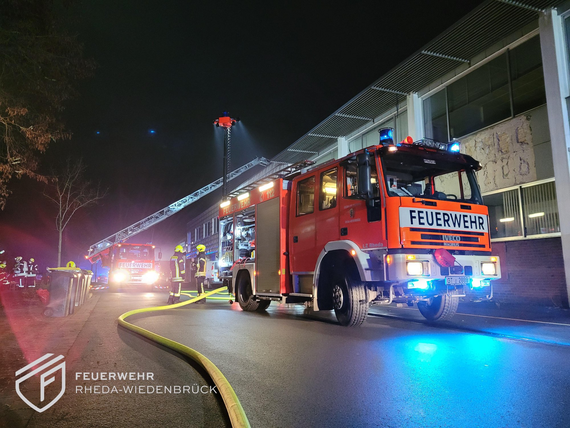 Der Einsatz dauerte bis 19.45 Uhr. Zwischendurch wurden die Kräfte an der Einsatzstelle reduziert und ausgewechselt. Unterstützung haben wir auch vom DRK Rheda-Wiedenbrück, dem städtischen Bauhof und den involvierten Firmen bekommen. Verletzt wurde niemand. Die Polizei hat die Ermittlungen zur Brandursache aufgenommen.