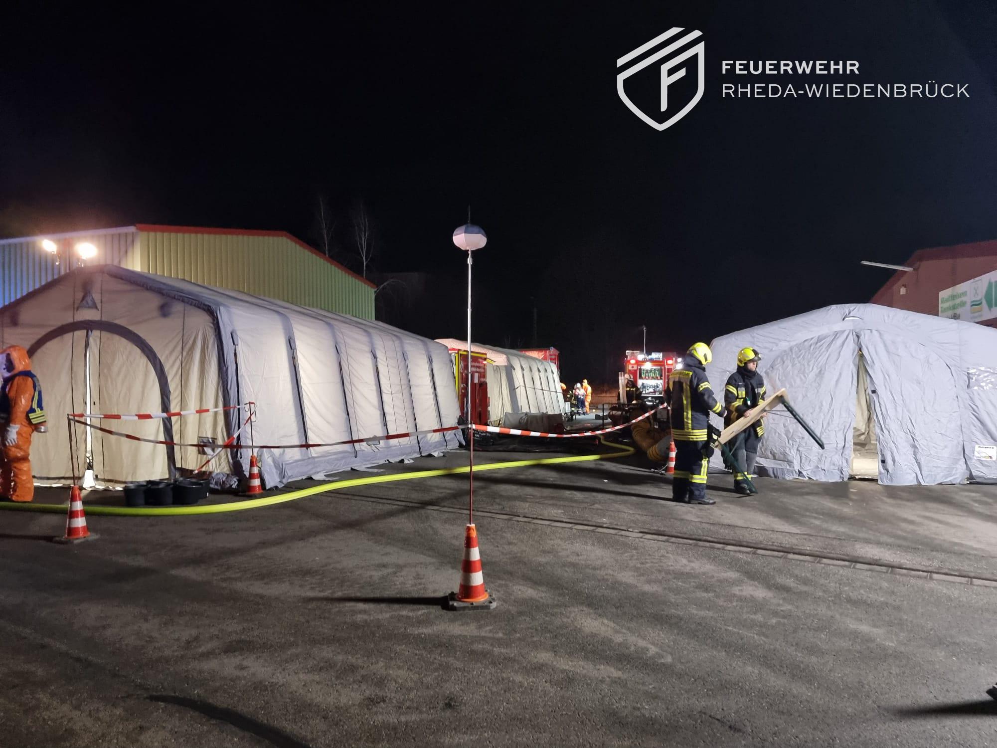 Der Löschzug Batenhorst wurde gestern Abend mit der ABC-Einheit des Kreises Gütersloh zu einem Großbrand nach Steinhagen alarmiert. Vor Ort wurde bei der Dekontamination der Einsatzkräfte im AB-V Dekon unterstützt. Des weiteren wurde der Aufbau und Betrieb von beheizten Aufenthaltszelten für die dekontaminierten Einsatzkräfte durchgeführt. Unsere Einsatzkräfte konnten heute Morgen gegen 6Uhr den Einsatz beenden.