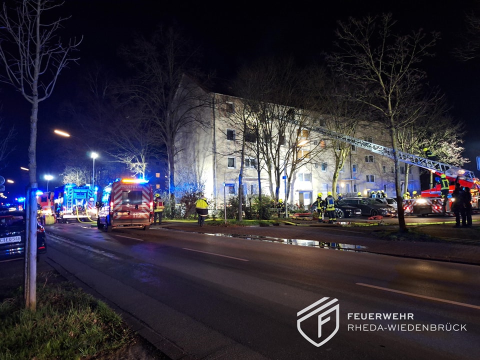 Am Dienstagabend ist es in einem Mehrfamilienhaus an der Mergelstraße in Rheda zu einem Wohnungsbrand gekommen. Bei unserem Eintreffen quoll dichter schwarzer Rauch aus einer Wohnung im 2. Obergeschoss. Während wir unsere Maßnahmen einleiteten, zündete die Wohnung durch. So waren umfangreiche Löscharbeiten mit insgesamt fünf Trupps unter Atemschutz nötig, bis das Feuer endgültig gelöscht war. Neben der Brandwohnung wurden auch drei weitere Wohnungen durch das Feuer so stark in Mitleidenschaft gezogen, dass die vorerst nicht mehr bewohnt werden können. Unmittelbar nach dem Eintreffen evakuierten die ersten Kräfte die letzten noch nicht geräumten Wohnungen des Hauses, sodass letztendlich niemand verletzt wurde. Nach rund drei Stunden war der Einsatz beendet.