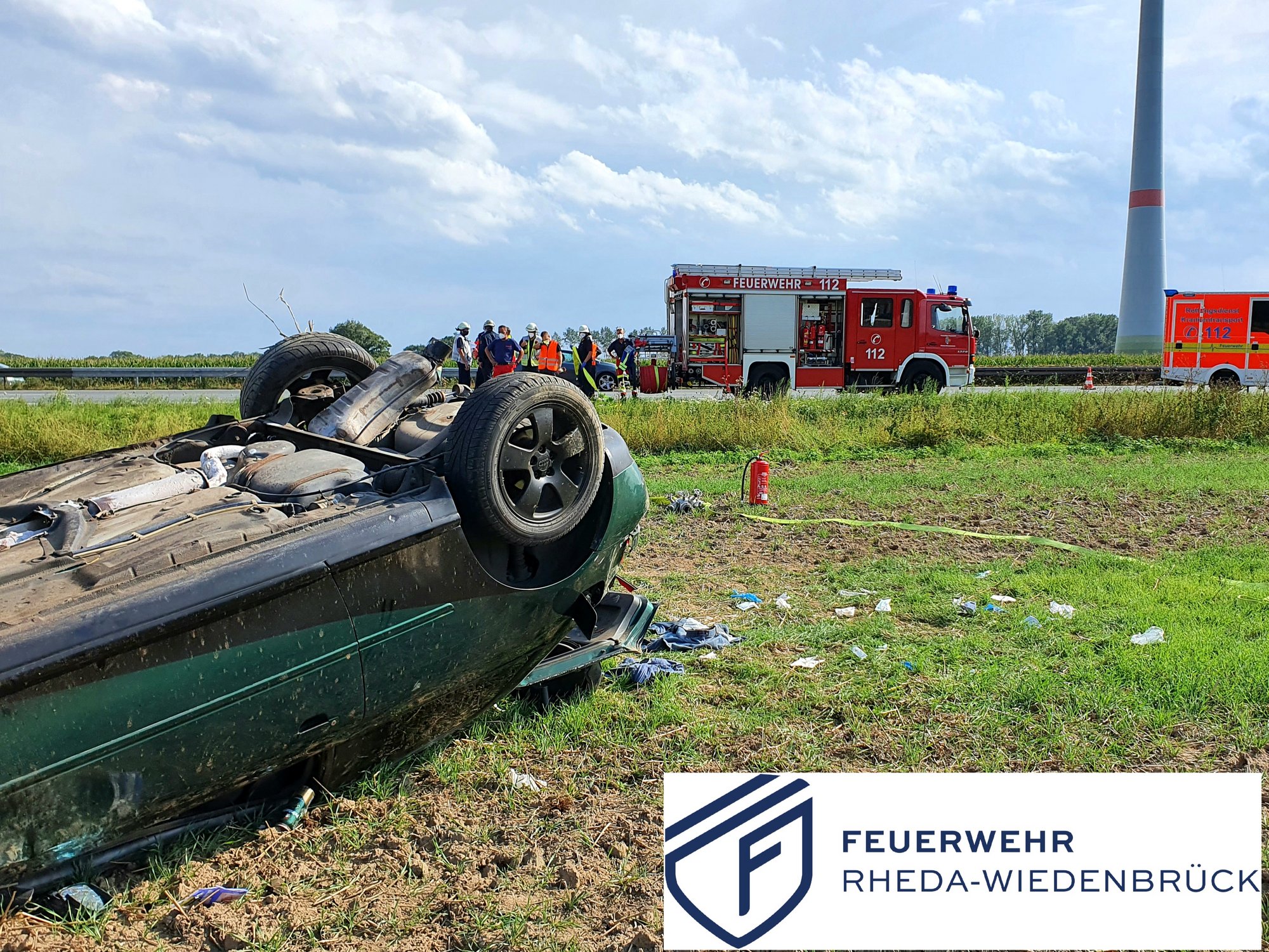 Auf der A2 ist es in Fahrtrichtung Dortmund zu einem schweren Verkehrsunfall gekommen. Zwei Personen wurden verletzt, eine davon schwer. Beide Personen wurden mit Rettungswagen in Krankenhäuser gebracht. Das Auto der schwer verletzten Person überschlug sich und blieb auf einem Feld auf dem Dach liegen. Entgegen erster Meldungen war keiner der Beteiligten eingeklemmt. Daher konnte auch der bereits angeforderte Rettungshubschrauber wieder umkehren. Wir unterstützten den Rettungsdienst bei der Versorgung der Patienten und sicherten zusammen mit der Autobahnpolizei die Unfallstelle gegen den fließenden Verkehr ab. Vor Ort waren drei Rettungswagen und die Notärzte aus Gütersloh und Rheda-Wiedenbrück. Auch der Leitende Notarzt und der Organisatorische Leiter des Rettungsdienstes im Kreis Gütersloh machten sich vor Ort ein Bild von der Lage.