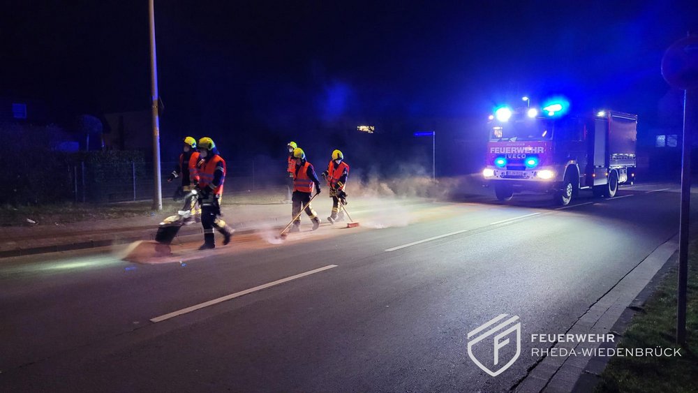 Eine Kraftstoffspur zog sich von der Hauptstraße in Wiedenbrück über die Schloß-, Wilhelm- und Herzebrocker Straße sowie den Bosfelder Weg bis ins Wohngebiet rund um die Alleestraße. Wir streuten die Kraftstoffspur mit mehr als 160 Kilo Bindemittel ab. Anschließend säuberte eine Kehrmaschine die Straße. Unterstützung bekamen wir vom städtischen Bauhof.