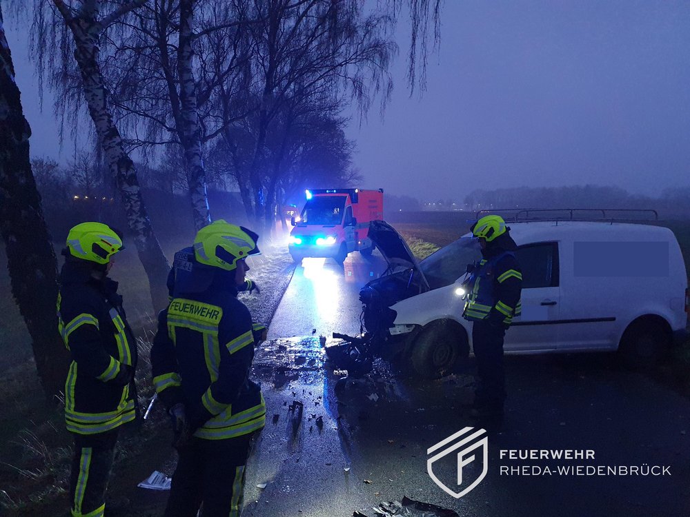 Am heutigen Donnerstag sind um 7.34 Uhr der Löschzug Rheda, die hauptamtliche Wache und der Rettungsdienst zu einem Verkehrsunfall auf der Marienfelder Straße gerufen worden. Auf Höhe des Klärwerks war es zu einem Zusammenstoß zwischen drei Pkw gekommen. Zwei Personen wurden bei dem Unfall verletzt und kamen in Krankenhäuser nach Wiedenbrück und Gütersloh. Entgegen erster Notrufmeldungen war niemand in seinem Fahrzeug eingeklemmt. Beim Eintreffen der ersten Einsatzkräfte war die Marienfelder Straße derart glatt, dass unser eigenes Streusalz nicht ausreichte und ein Streufahrzeug des städtischen Bauhofs angefordert werden musste.