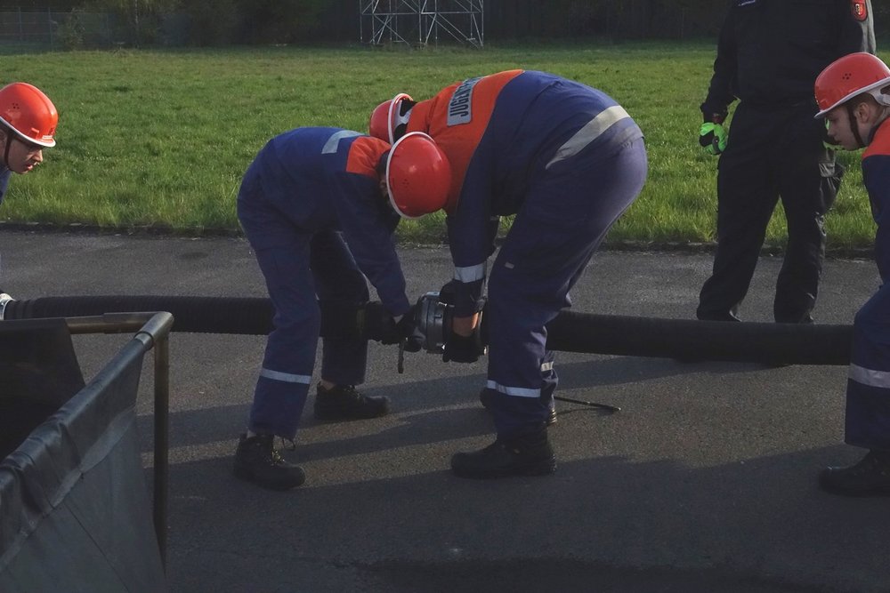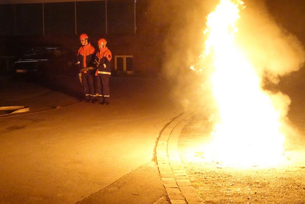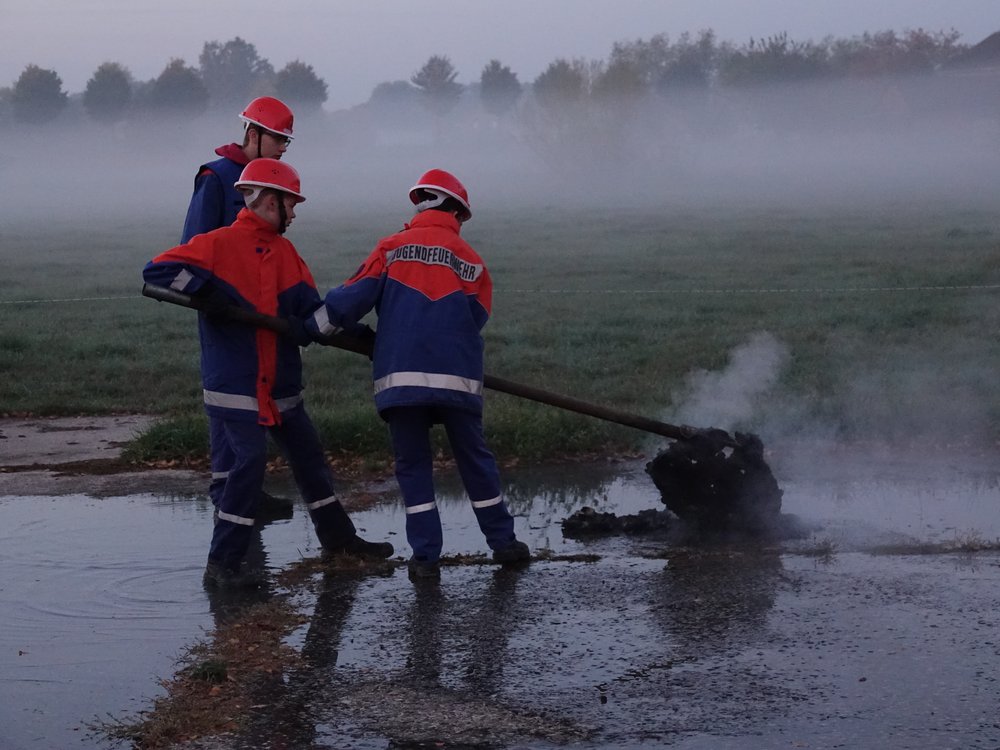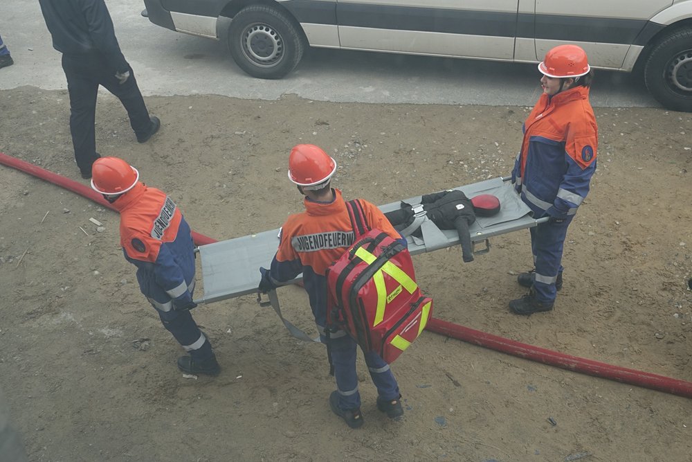 Ein aufgeregter Besitzer einer Industrie meldete einen Brand an einer neu angeschafften Maschine und teilte eine unbekannte Anzahl von vermissten Personen mit. Die Jugendfeuerwehr rückte mit vier Fahrzeugen an, die jeweils unterschiedliche Aufgaben bei der Brandbekämpfung und der Personensuche übernahmen. Die Jugendlichen auf dem ersteintreffenden Fahrzeug an der Einsatzstelle, rüsteten sich mit Atemschutzgeräten aus und begannen die Brandbekämpfung an der Maschine sowie die Suche nach den vermissten Personen. Die nachfolgenden Fahrzeuge stellten die Wasserversorgung her und bekämpften den Brand von beiden Seite der Industriehalle. Eine besondere Aufgabe dabei war es Gasflaschen zu kühlen, die sich in der Nähe der brennenden Maschine befanden. Am Ende der Übung stellte sich heraus, dass alle sich in Gefahr befindenden Personen gerettet wurden. Auch der Brand konnte erfolgreich gelöscht werden.