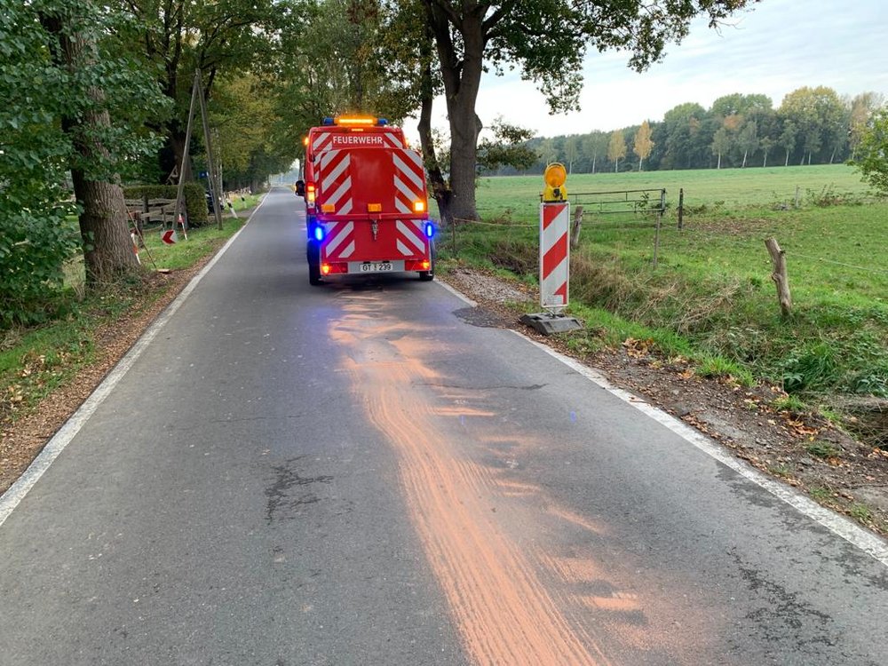 Ein einsatzreicher Tag für den Löschzug Lintel: Nachdem bereits zwei Einsätze am Vormittag zusammen mit anderen Löschzügen abgewickelt wurden, kam noch ein dritter Einsatz am Nachmittag hinzu. Auf der Neuenkirchener Landstraße musste eine ca. 200m lange Ölspur abgestreut werden.