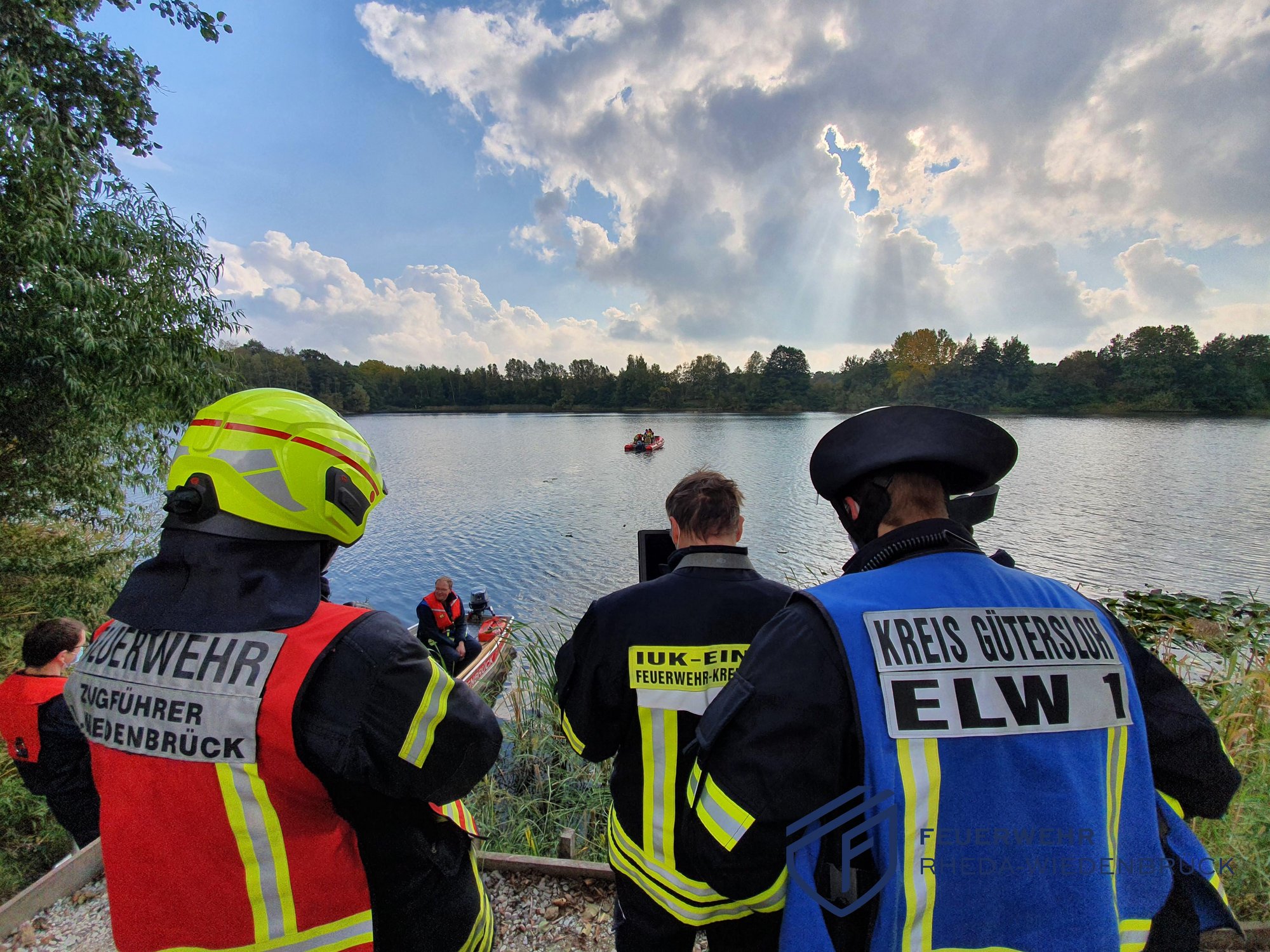 Nachdem die Polizei am Buxelsee Hinweise gefunden hat, dass sich dort eine Person in einer hilflosen Lage befinden könnte, ist Großalarm für die Feuerwehr Rheda-Wiedenbrück sowie die Deutsche Lebensrettungsgesellschaft (DLRG) ausgelöst worden. Vor Ort wurde der See vom Ufer aus sowie von insgesamt drei Booten abgesucht. Auch eine Drohne mit Wärmebildkamera der IuK-Einheit des Kreises Gütersloh sowie ein Spezialboot mit Sonargerät der Feuerwehr Delbrück kamen zum Einsatz. Drei Taucher der DLRG stiegen ins Wasser, um dort nach der Person zu suchen. Nach knapp fünf Stunden Einsatzdauer wurde die Suche erfolglos abgebrochen.