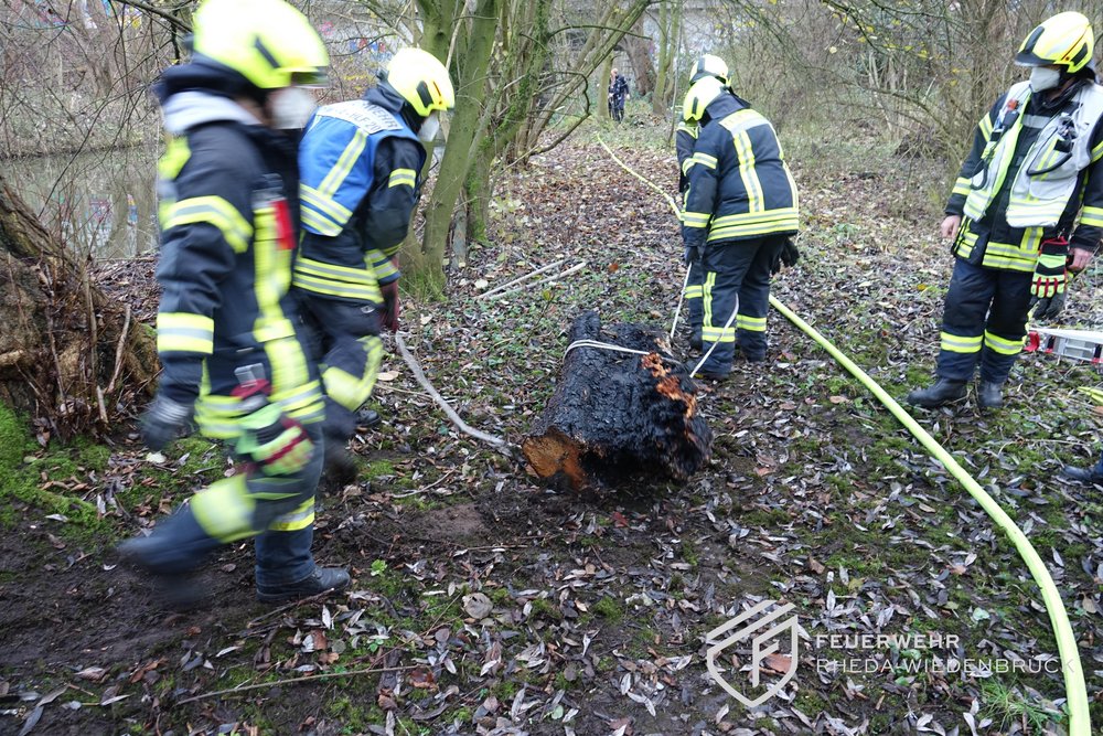 Mitten im Flora-Westfalica-Park ist es zu einem Brand gekommen. Zwischen Ems und dem Aqua-Tunnel (unter der A2) war ein Baum in Brand geraten. Um das Feuer zu löschen, mussten die Kräfte des Löschzuges Rheda eine lange Schlauchleitung durch den Wald legen. Nach den Löscharbeiten wurde der Baum gefällt und zur weiteren Kühlung in der nahen Ems, an einer Leine gesichert, versenkt. In der gut besuchten Flora Westfalica sorgte der Einsatz für reges Interesse. Die Polizei hat ihre Ermittlungen zur Brandursache aufgenommen.