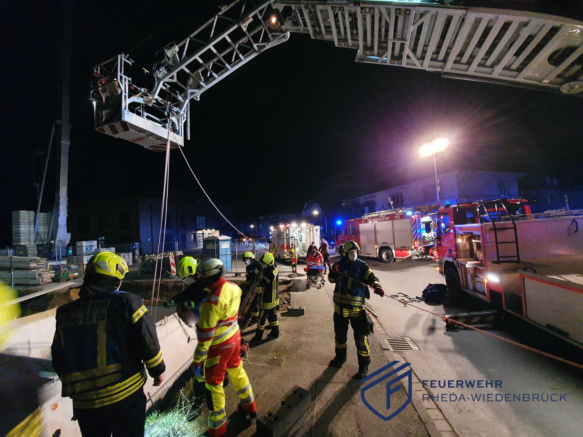 Am Samstagabend war eine Person in die Baugrube der Großbaustelle Am Rondell in Rheda gestürzt. Bei unserem Eintreffen lag die männliche Person regungslos in circa 5 Meter Tiefe. Wir verschafften uns und dem Rettungsdienst mittels Steckleiter einen Zugang zu der Baugrube. Parallel wurde die Drehleiter in Stellung gebracht und die Einsatzstelle durch das LF 20 ausgeleuchtet. Nach einer ersten Untersuchung durch den Rettungsdienst in der Baugrube, wurde die Person in die Schleifkorbtrage gelegt und schließlich mittels an der Drehleiter befestigtem Flaschenzug schonend aus der Grube gehoben. Es folgte eine ausführliche Untersuchung durch Notärtzin und Rettungsdienst im Rettungswagen. Wir sicherten abschließend die Baugrube wieder mit den vorhandenen Bauzäunen ab. Zur Ursache des Sturzes hat die Polizei ihre Ermittlungen aufgenommen.