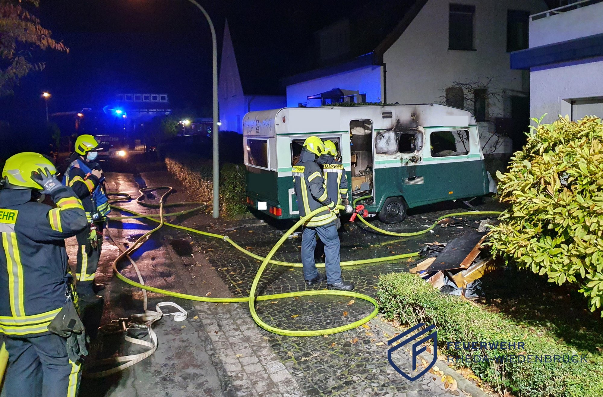 In der Schillerstraße in Rheda war ein nah an Büschen und Häusern geparkter Wohnwagen in Brand geraten. Das Feuer konnte durch die Vornahme von zwei C-Rohren schnell eingedämmt und eine Ausbreitung verhindert werden. Um alle Glutnester ablöschen zu können, mussten Teile der Inneneinrichtung des Wohnwagens unter Atemschutz demontiert werden.