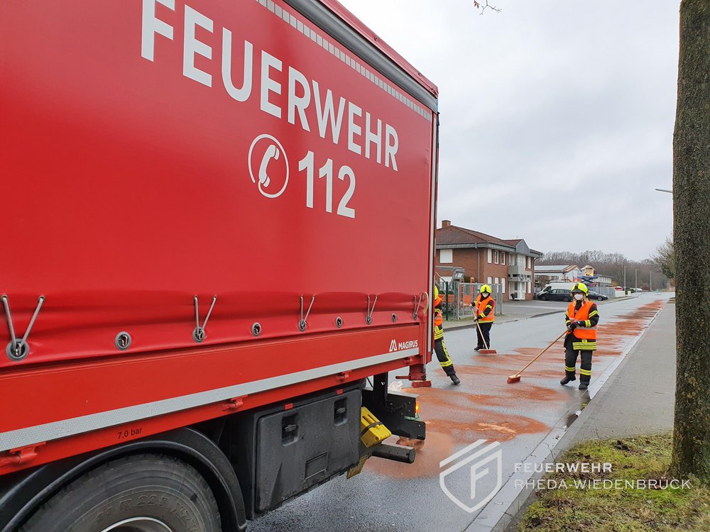 Eine Ölspur zog sich von der Gütersloher Straße kommend über die Herzebrocker Straße und den Bosfelder Weg bis in das dortige Industriegebiet. Wir streuten die Ölspur mit mehr als 200 Kilo Bindemittel ab, die später von einer Kehrmaschine wieder aufgenommen wurden. Der Bauhof stellte Warnschilder auf.