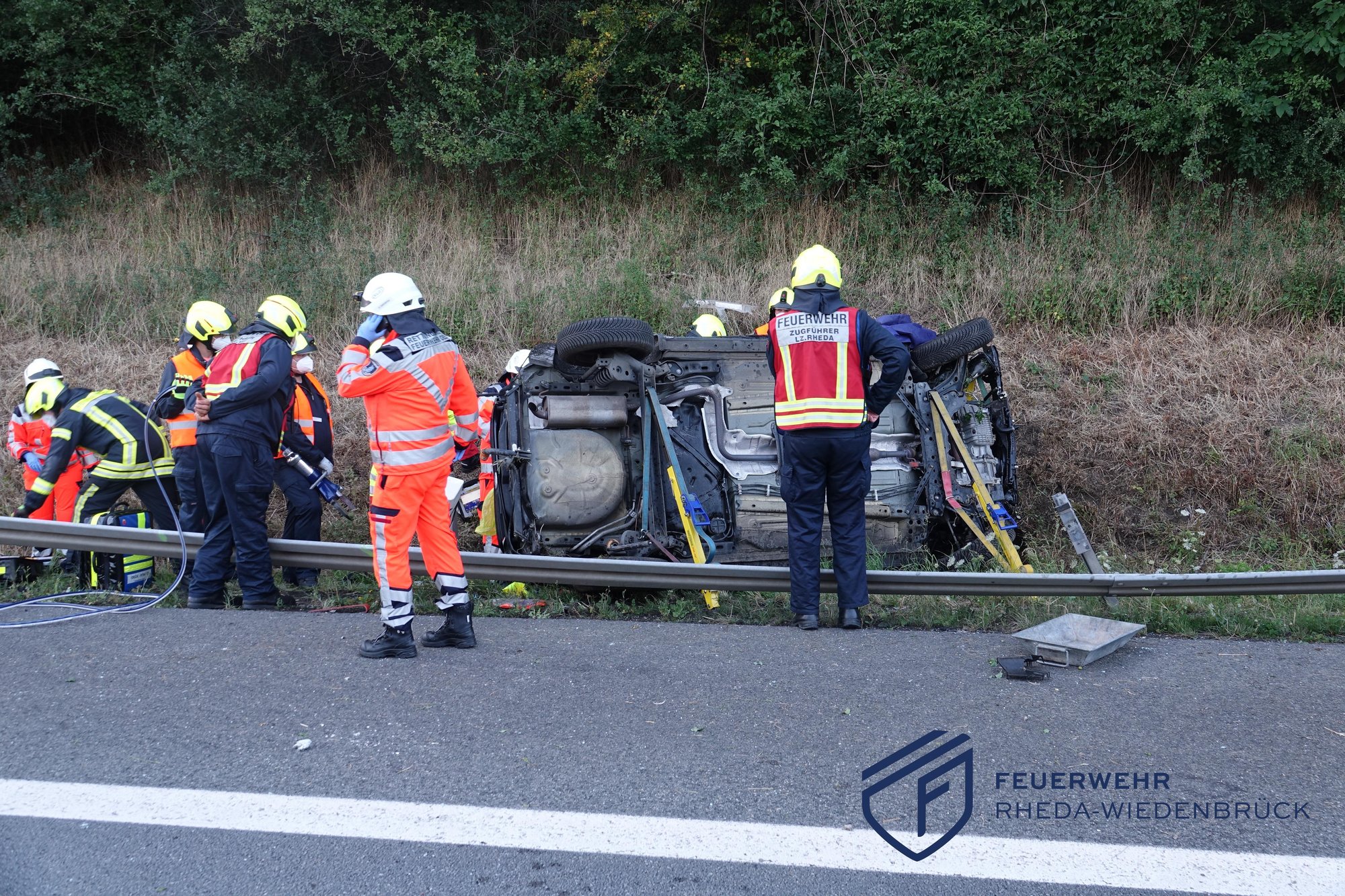 Bei einem Verkehrsunfall auf der Autobahn kam ein Fahrzeug von der Fahrbahn ab und überschlug sich mehrfach. Wir befreiten die eingeschlossene Person mit unseren Hydraulikwerkzeugen. Die weitere Behandlung übernahm der Rettungsdienst. Wir streuten Betriebsstoffe ab und sicherten die Unfallstelle während des Einsatzes ab.