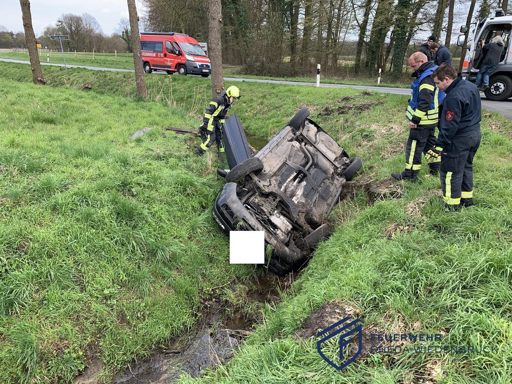 Auf der Straße Marburg war ein Pkw von der Fahrbahn abgekommen und auf dem Dach im Straßengraben liegen geblieben. Aus dem Fahrzeug liefen nun Betriebsstoffe aus, die sich über den mit Wasser gefüllten Graben verteilten. Wir setzten in Absprache mit der Unteren Wasserbehörde mehrere Ölsperren und brachten schwimmfähiges Bindemittel auf. Ein Spezialunternehmen saugte das verschmutzte Wasser ab. Ein Abschlepper konnte den Pkw aus dem Graben ziehen. Verletzt wurde niemand.