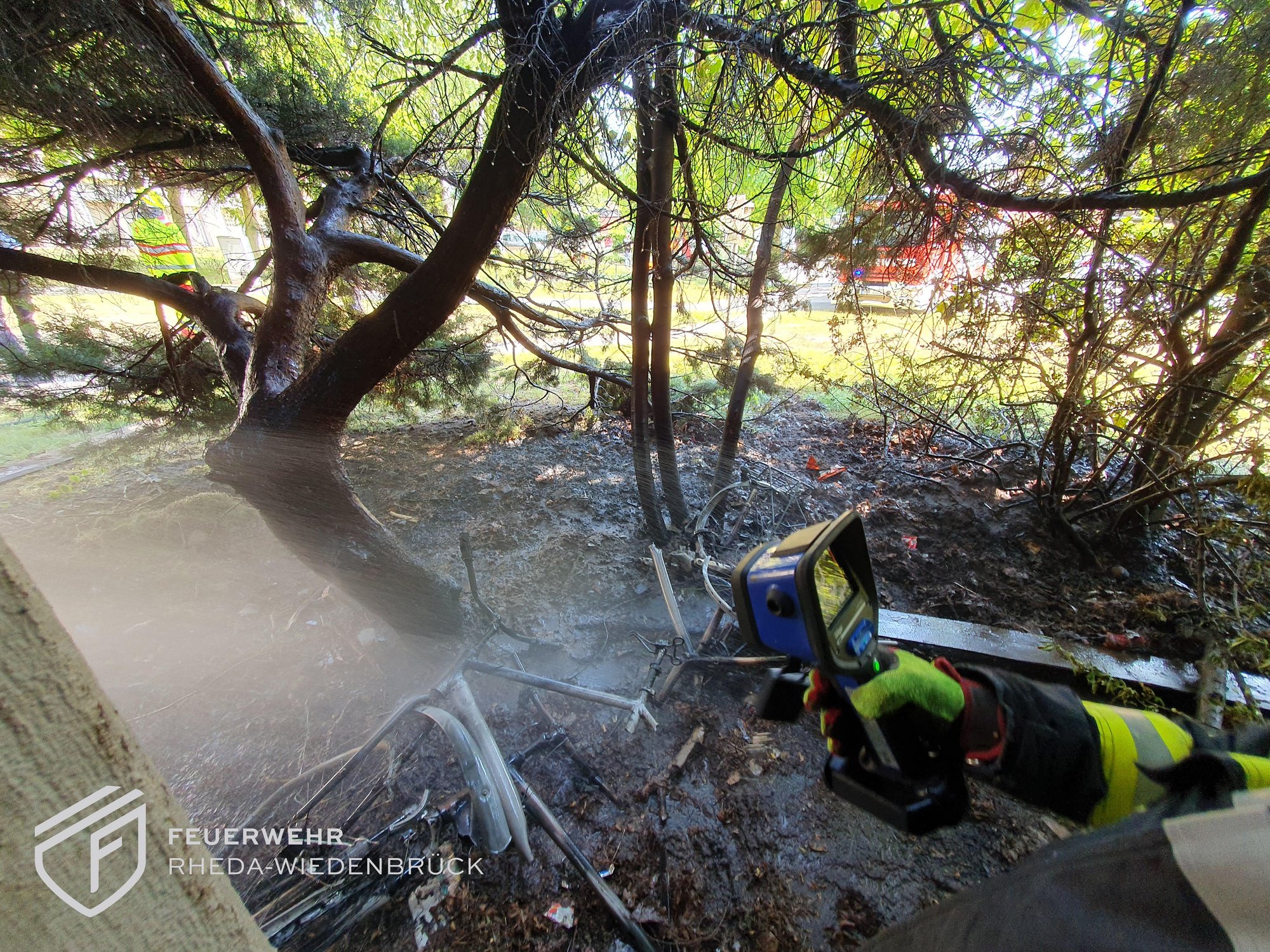 Unmittelbar an einem Mehrfamilienhaus war ein großes Gebüsch in Brand geraten. Bewohner konnten das Feuer mit mehreren Feuerlöschen bereits eindämmen. Wir führten Nachlöscharbeiten durch. Eine Wohnung war durch den Brand verraucht und wurde von uns belüftet.