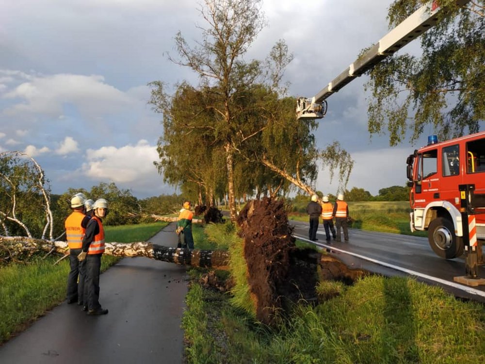 Als Folge dessen wurden wir zu mehreren umgestürzten Bäumen alarmiert. Unter Anderem mussten diese vom Korb unseres HULF abgetragen werden.