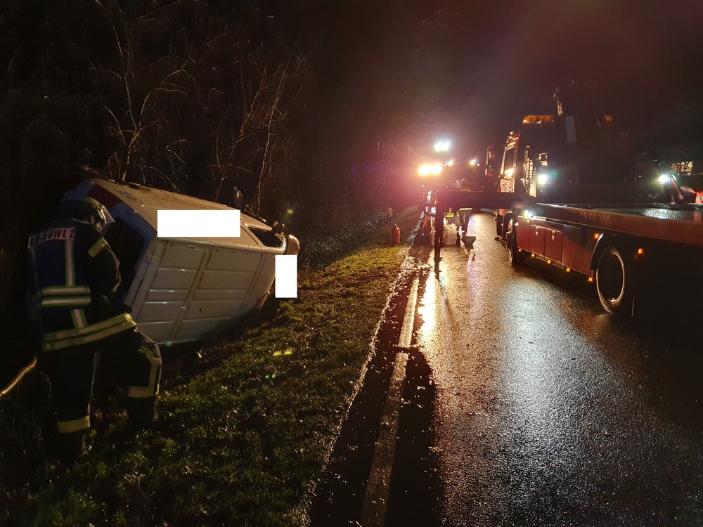 Auf der Gütersloher Straße war es in Höhe eines Industrieunternehmens zu einem Verkehrsunfall gekommen. Dabei kam ein Lieferwagen von der Straße ab und landete stark beschädigt im Straßengraben. Der Fahrer kam mit schweren Verletzungen in ein Bielefelder Krankenhaus. Die Einsatzstelle wurde durch uns ausgeleuchtet und abgesichert. Nach dem das Fahrzeug durch ein Abschleppunternehmen geborgen war, unterstützten wir die Polizei bei der Spurensicherung. Während des Einsatzes blieb die Gütersloher Straße in beide Richtungen gesperrt.