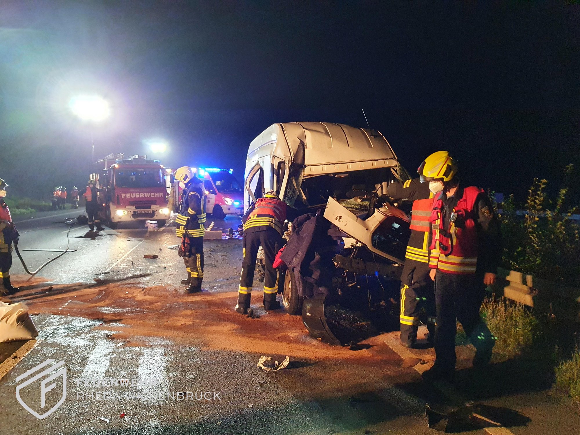 Glück im Unglück hatte der Fahrer eines Transportes auf der A2: In Fahrtrichtung Dortmund war er in Höhe der Brücke „An der Wegböhne“ mit einem Lkw kollidiert. Die Feuerwehr wurde alarmiert, da davon auszugehen war, dass der Mann in seinem Führerhaus eingeklemmt war - dies war aber nicht der Fall. Die Kräfte der Löschzüge Rheda und Wiedenbrück mussten ihm lediglich helfen, aus seinem Fahrzeug zu klettern. Augenscheinlich unverletzt kam er vorsichtshalber zur Kontrolle in ein Krankenhaus. Anschließend galt es für die Feuerwehr die Fahrbahn zu reinigen und auslaufende Betriebsstoffe abzustreuen.
