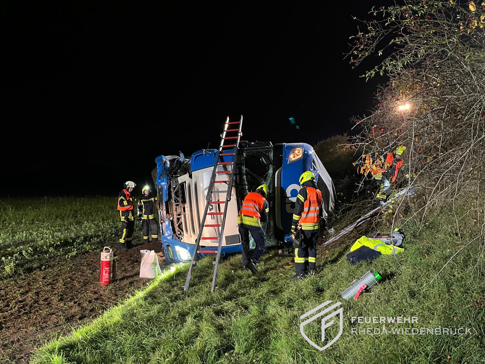 Um 19:09 Uhr wurden wir auf die Autobahn 2 alarmiert. Dort war ein Sattelzug kurz hinter der Anschlussstelle Rheda-Wiedenbrück von der Richtungsfahrbahn Hannover abgekommen, hatte sich überschlagen und war auf der Seite liegend auf einem im Vergleich zur Fahrbahn deutlich tiefer liegenden Feld zum Stillstand gekommen. Der Fahrer konnte unverletzt sein Führerhaus verlassen. Die Feuerwehr stellte den Brandschutz sicher und leuchtete die Einsatzstelle aus. Im Verlauf des Einsatzes wurde letztere Aufgabe durch das Technische Hilfswerk Gütersloh übernommen. Der Sattelzug und seine Ladung mussten aufwendig geborgen werden und das Erdreich unter dem Lkw ausgebaggert werden. Dafür kamen auf Anweisung der Unteren Wasserbehörde mehrere Bergungsunternehmen zum Einsatz. Der Einsatz war für die Feuerwehr gegen 1 Uhr beendet.