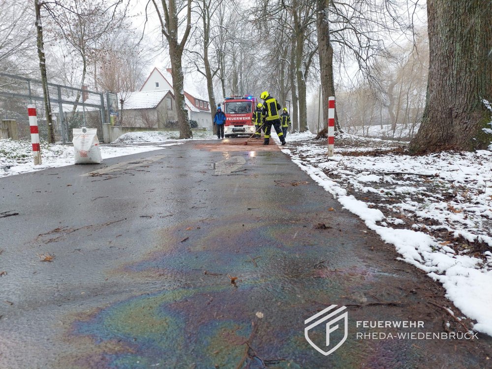 Eine lange Ölspur zog sich über den kompletten Fahrradweg, der auf der einstigen Bahntrasse durch die Flora Westfalica errichtet wurde. Ebenso war die Straße Am Werl sowie Teile der Pixeler Straße betroffen. Wir streuten die Ölspur mit Bindemittel und Unterstützung des städtischen Bauhofs ab.