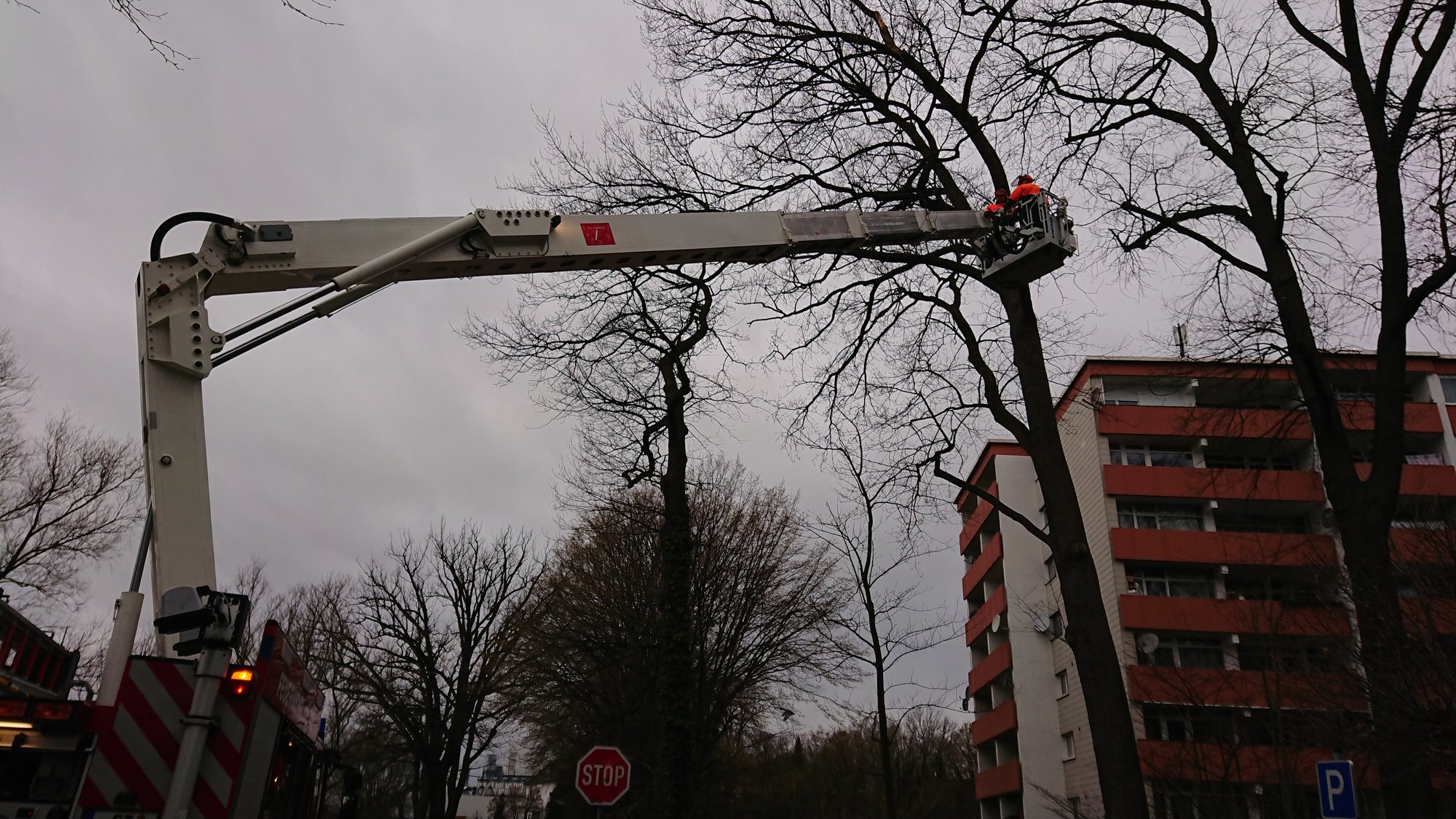 Ein größer Ast ist aus einem Baum abgebrochen und ist in weiteren Ästen hängen geblieben. Er drohte auf einen Parkplatz zu stürzen.