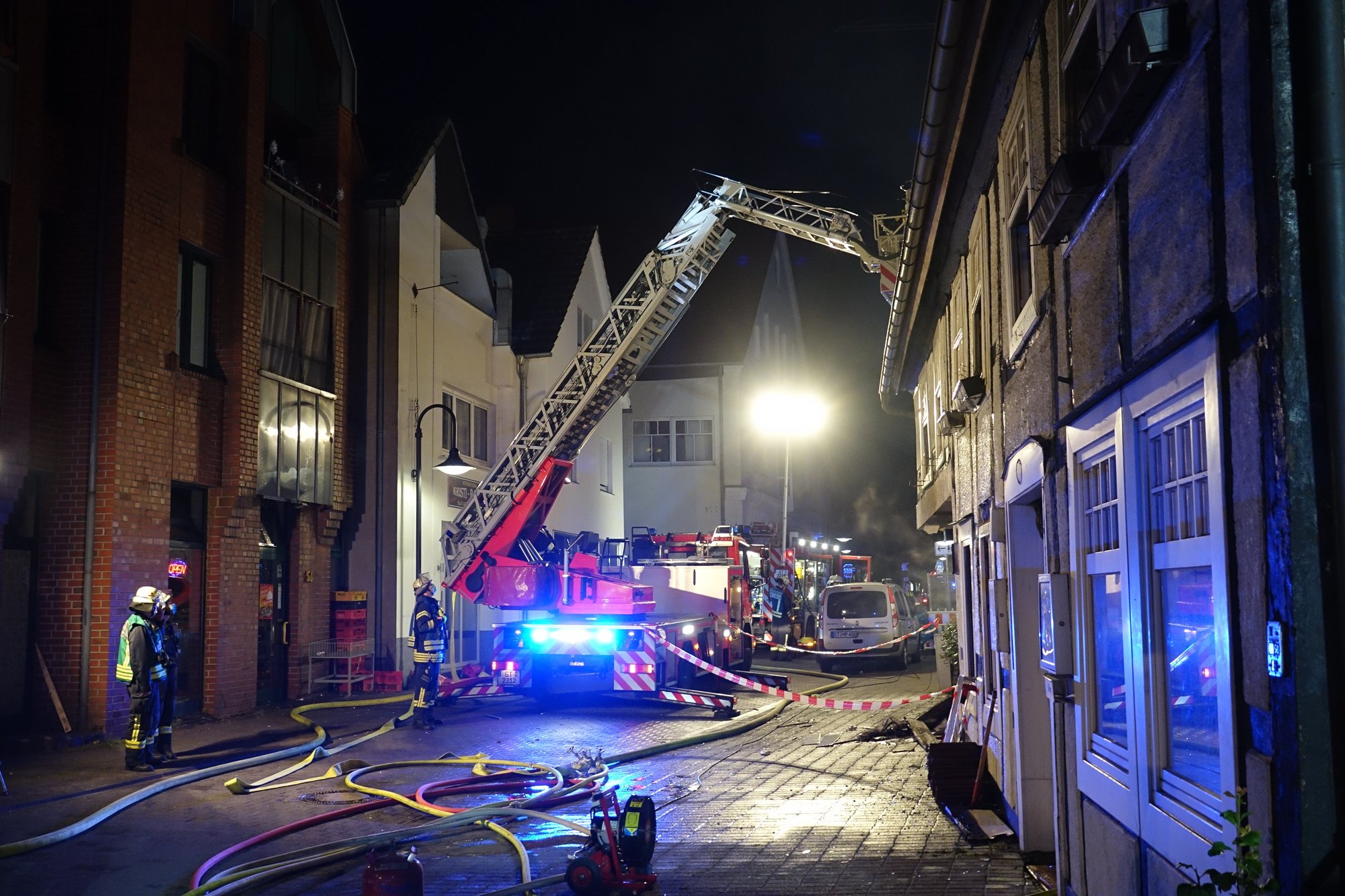 Um 4 Uhr in der Nacht ist die Feuerwehr Rheda-Wiedenbrück zu einem Großbrand alarmiert worden. An der Berliner Straße - unweit der St.-Clemens-Kirche - brannte das Erdgeschoss eines sich im Umbau befindlichen Fachwerkhauses. Unmittelbar nach dem Eintreffen der ersten Fahrzeuge gingen mehrere Trupps unter Atemschutz und mit C-Rohren in das Gebäude vor, um die Flammen zu bekämpfen. Da sich diese auch bereits in die hölzerne Decke vorgearbeitet hatten, dauerten die Löscharbeiten über einen längeren Zeitraum an. Insgesamt löschten vier Trupps in dem als Denkmal geschützten Gebäude. Des Weiteren wurde das Dach mittels Drehleiter kontrolliert. Eine Ausbreitung auf nebenstehende Gebäude konnte trotz der sehr engen Bebauung verhindert werden. Menschen wurden nicht verletzt. Während der Löscharbeiten blieben Berliner und Wilhelmstraße gesperrt.