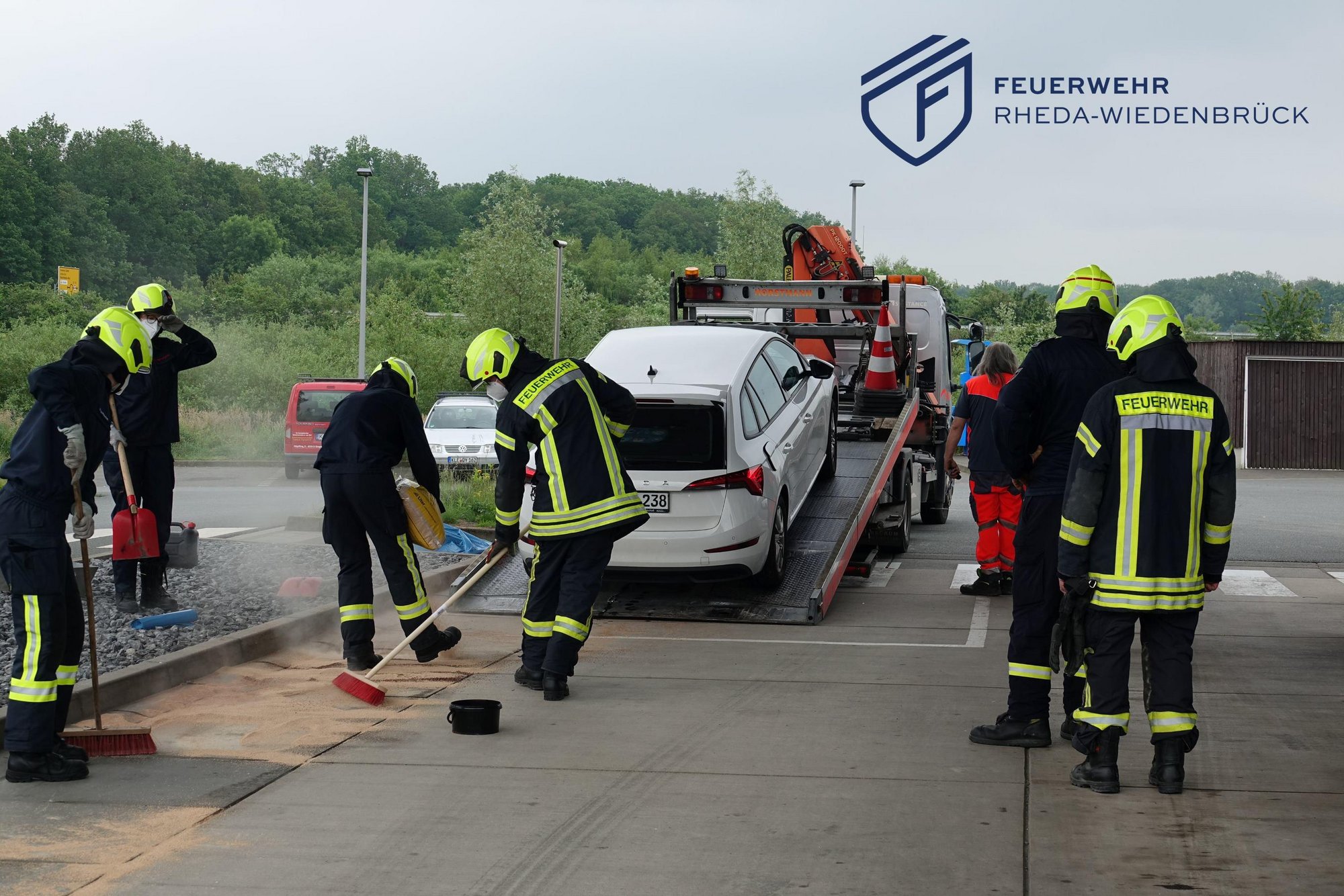 Ein PKW-Fahrer hatte sich auf der BAB 2 seinen Benzintank aufgerissen und konnte das Fahrzeug noch in das Gewerbegebiet Aurea steuern. Der Löschzug St. Vit wurde zu dem defekten Fahrzeug alarmiert, um unkontrolliertes Austreten des Benzins zu verhindern. Vor Ort wurde das auslaufende Benzin aufgefangen, der Brandschutz sichergestellt und die bereits ausgelaufenen Mengen mit Bindemittel abgestreut. Das Fahrzeug wurde von einem Abschleppunternehmen abtransportiert.