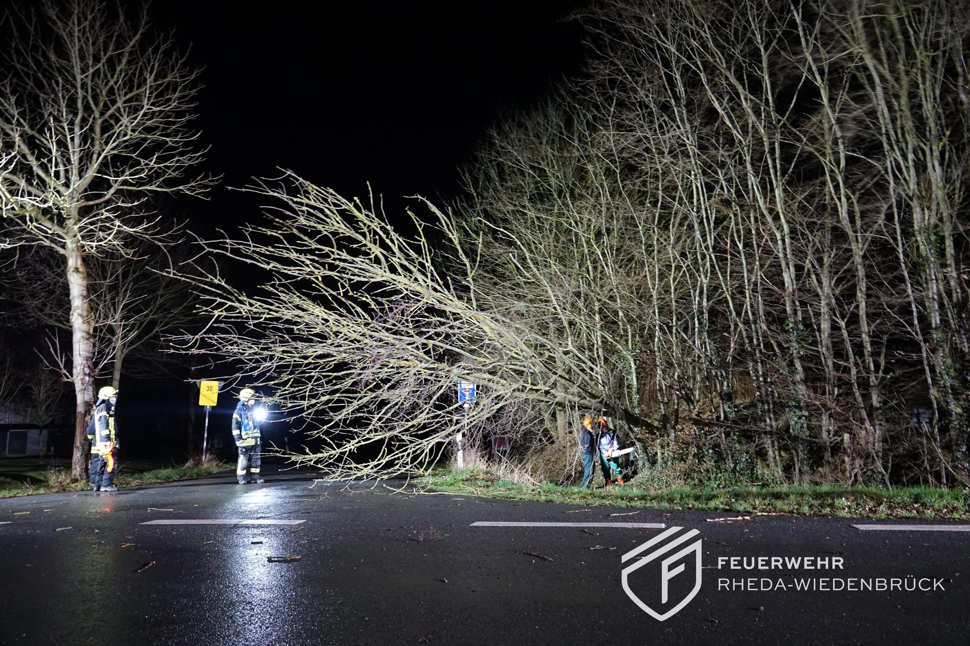 Ein Baum hatte sich entwurzelt und hing über der Straße. Wir fällten den Baum mittels Kettensäge und beseitigten die Gefahrenstelle.